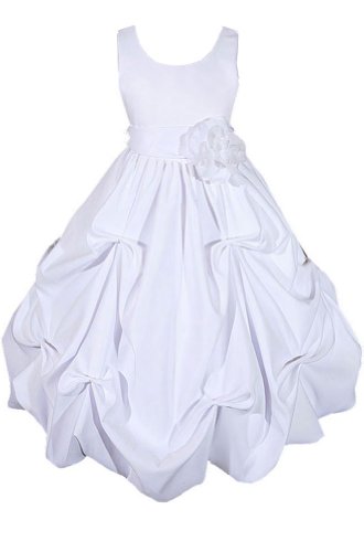 This Princess Dress is perfect for a Flower Girl Wedding Dress, Graduation Dress, Junior Bridesmaid Dress, Pageant Holiday Dress, Easter Dress, and a Special Dress for her birthday Party or Heavenly keepsake pictures. The entire dress is made out of high quality satin. There is a removable satin sash with a flower on the waistline. The bubble pick-up style skirt has 2 layers with a crinoline netting inside for additional fullness. The back of the dress has a hidden zipper and a tie sash for a perfect fit at the waist. Absolutely Gorgeous!