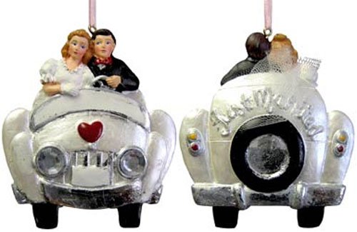 Our Just Married Wedding Ornamentsare 7.5 inches long and 3 inches across. The Our First Christmas Together Ornament shows the back of a car, as if the couple, seated in the car, are driving away from the Church and headed for their honeymoon. The couple, in the just married ornaments, is still wearing their wedding clothes, the man is in a black suit coat and the woman is wearing her wedding gown and illusion veil. The Unique Christmas Ornaments car is white and shows the silver bumper with strings of cans trailing behind the car. Above the just married ornaments bumper is a white spare tire, the words "Just Married" are printed on the back of the seat above the spare tire. There is a inch round bead, representing brake lights, on either side of the just married ornaments car. The just married ornaments hang from a 3 inch loop of white satin ribbon.