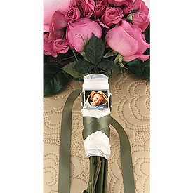 Loved ones who have passed can be with you as you walk down the aisle with a Silver-tone memory buckle.Attach a photo to the buckle with glue dots or double-sided tape, choose a ribbon and wrap the buckle around your bouquet for a beautiful and sentimental decoration.Buckle measures 1 3/8" x 1 1/4".Glue dots and double-sided tape NOT included. Ribbon sold separately.